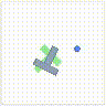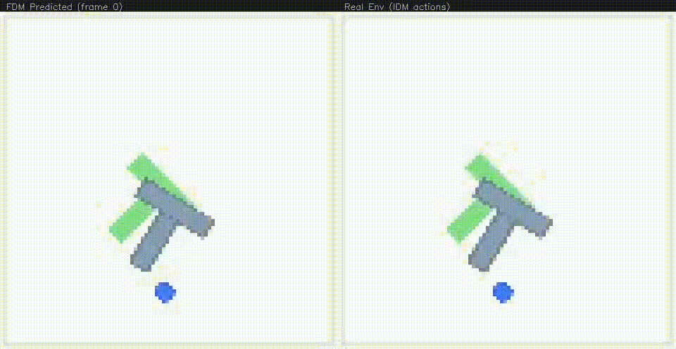 In PushT, the policy controls a pointer, which a blue dot (subsequently referred to as the agent) follows non-instantaneously. The agent’s velocity towards the pointer is determined by its distance from the pointer (farther -> faster). The agent can push around a T-shaped object that is randomly initialized in the environment. The agent succeeds when the object superposes a non-moving green silhouette of itself with high overlap. We choose PushT because of its low visual complexity but non-trivial difficulty. In this environment, we do not explicitly condition on language, or specify the state as the location of the agent is entirely represented visually in the frame.