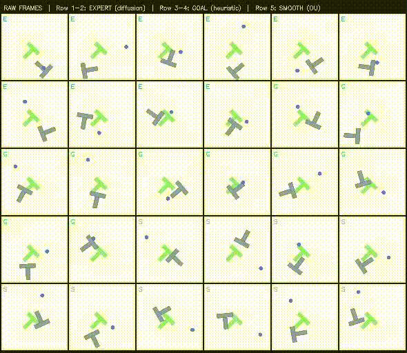 Without a source of conditioning, randomness in our data will lead to randomness in predicted frames and inferred actions. Hence, we use an existing strong diffusion policy and record the agent running this policy. The causal video model is then implicitly learning to imitate this policy during training. By launching parallel cloud environments, we're able to quickly collect ~2.6M frames of video, or ~72 hours at 10 frames per second of expert policy interacting in the environment. We also collect ~324 hours of random smooth movement and ~73 hours of heuristic goal-driven policy, for a total of ~16.8M frames. During training we transition from a 70/15/15 random/goal/expert split to a 0/20/80 and finally a 0/5/95 split as we shift from prioritizing learning basic dynamics to learning the optimal policy for PushT.1